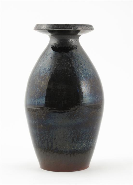 A Poole Pottery Atlantis vase, by Jenny Haigh slender, swollen form with wide flaring top rim, glazed with tenmoku glaze 30cm. high