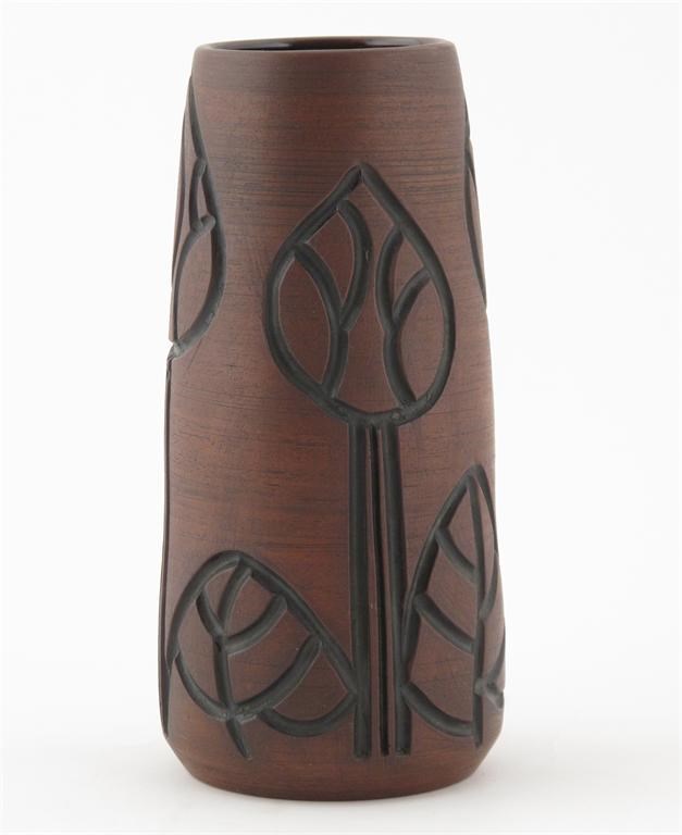 A Poole Pottery Atlantis vase, by Catherine Connett, incised with leaf design, glazed black on terracotta, impressed and incised marks 21cm. high