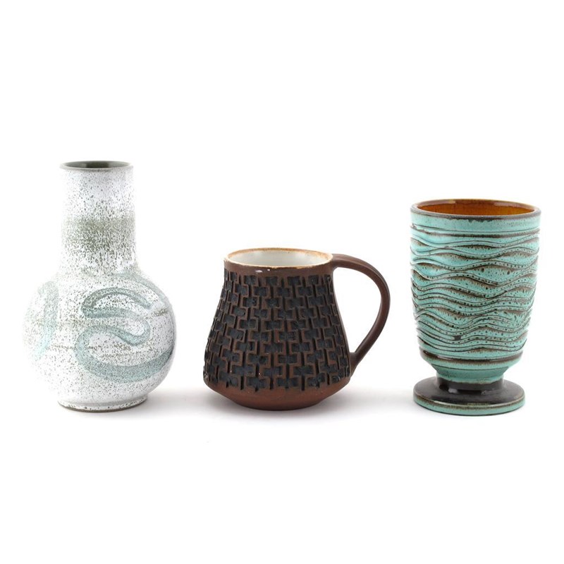 A Poole Pottery Atlantis vase by Carol Kellet, ovoid with collar neck, painted decoration, a footed vase and a Guy Sydenham mug impressed and incised marks 18cm. high