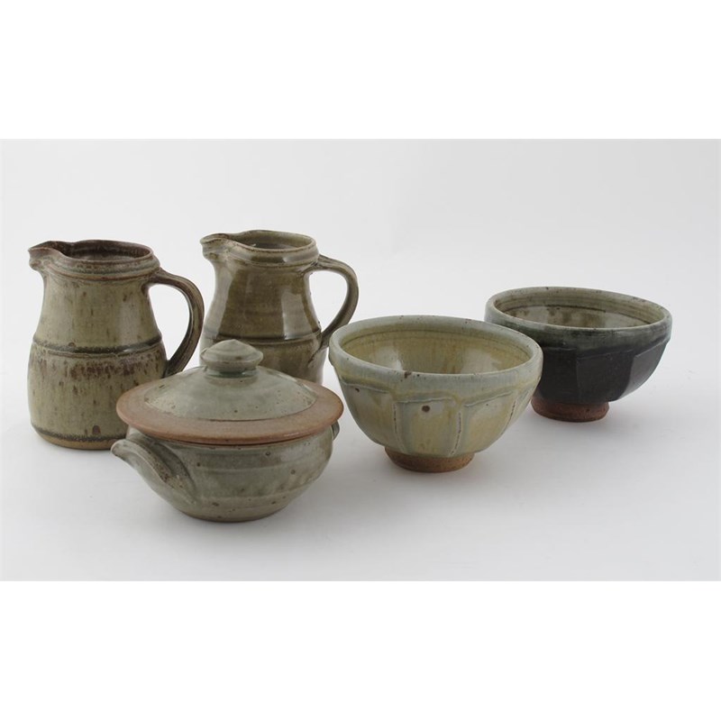 a stoneware cut sided bowl, another similar, two jugs and a covered pot unsigned bowl 15cm. diam.