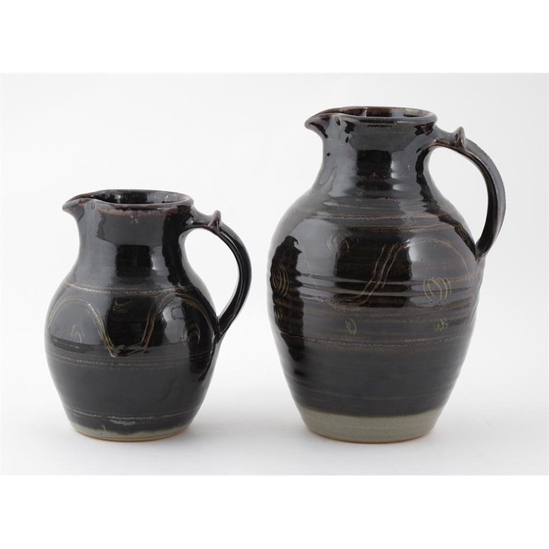 a Winchcombe Pottery jug, glazed to the foot in tenmoku with painted comb band, and another smaller impressed Winchcombe seal 30cm. high