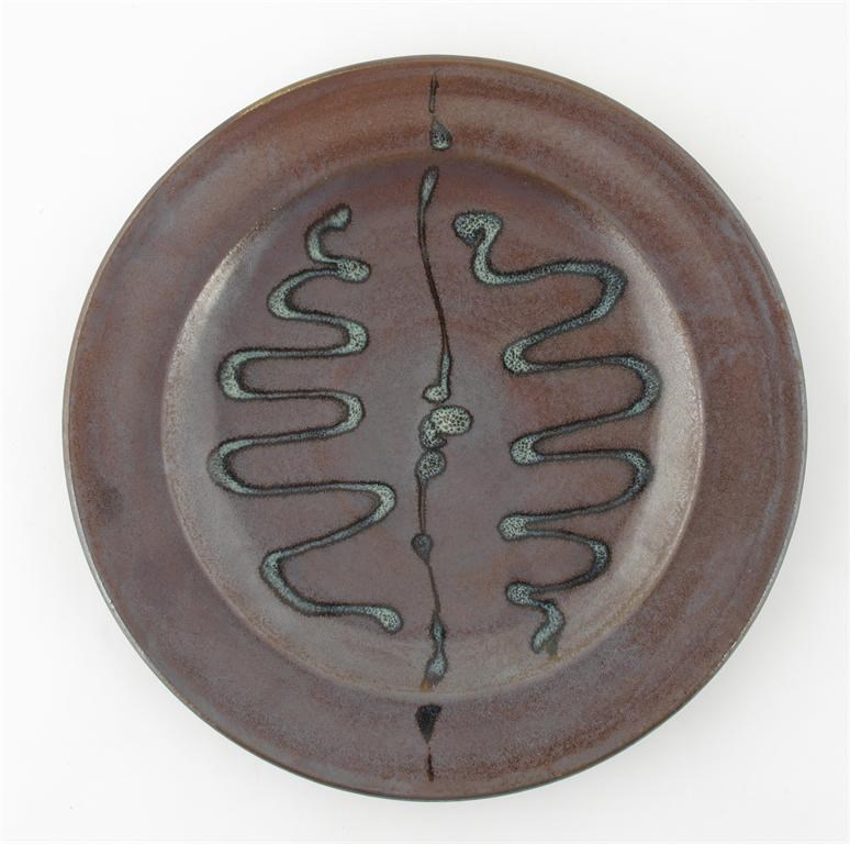 a Winchcombe Pottery charger painted with simple reflected comb design on a brown lustre ground impressed seal mark 31cm. diam.