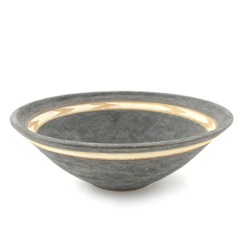 a flaring bowl incised with a band of chevron, on black oxidised glaze painted Gilmour 26.5cm. diam.