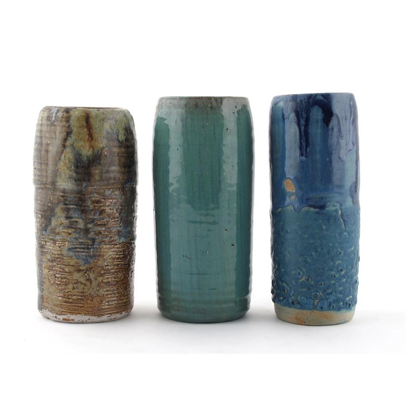 an Oxshott Pottery vase, cylindrical form with inverted rim, glazed to the foot, and two other Oxshott vases incised marks 18cm. high