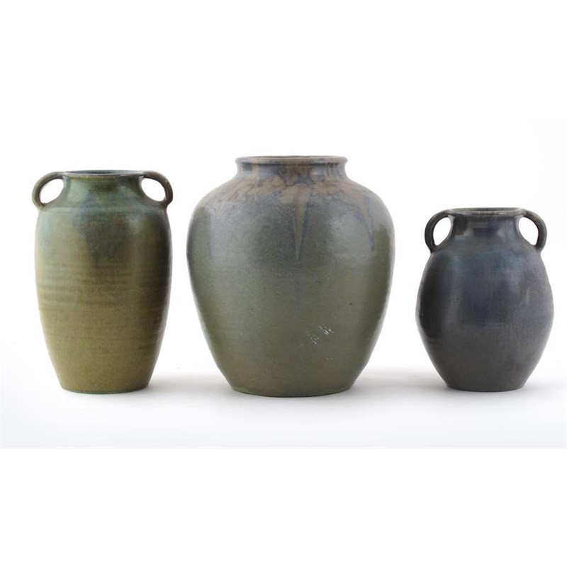 A large Upchurch Pottery vase, shouldered form glazed green and blue, and two other Upchurch vases stamped marks 28cm. high