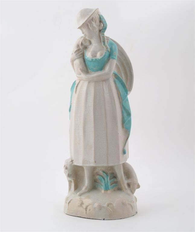 A continental pottery model of a shepherdess and two lambs, crackle glaze highlighted in blue, impressed factory mark 47cm. high