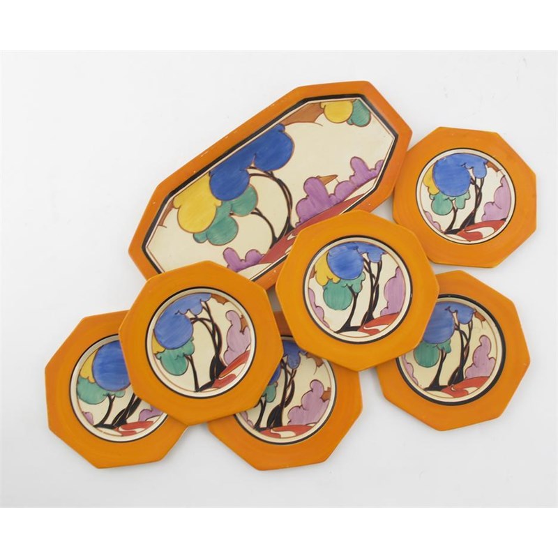 'Autumn' a Clarice Cliff Fantasque Bizarre sandwich set for six, painted in colours inside orange band, comprising tray and six side plates printed marks tray 29.5cm. wide