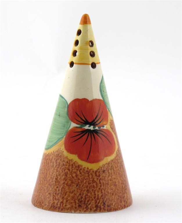 'Nasturtium' a Clarice Cliff Bizarre Conical sugar sifter, painted in colours 14cm. high