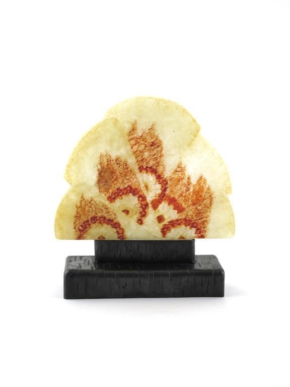 A Gabriel Argy-Rousseau pate de verre glass light, the fan shaped lighting plate cast in low relief with flowers in iron red on a yellow ground, on stepped patinated metal base signed in the cast G Argy Rousseau plate 17.3cm. high