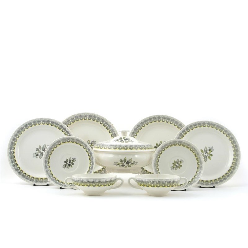 'Persephone' a Wedgwood earthenware part dinner service, designed by Eric Ravilious, printed in yellow and black, comprising; two tureens and covers, five twin-handled soup bowls and four saucers, three dinner, five entree and six side plates printed marks, damages largest plate, 25.5cm. diam.