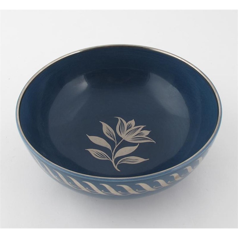 A Wedgwood Pottery bowl, probably Alfred or Louise Powell, painted to the well with a silver flower stem, on a blue ground impressed marks 23cm. diam.