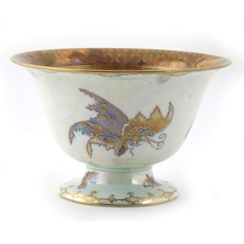 A Wedgwood Pottery Butterfly lustre Antique bowl, designed by Daisy Makeig Jones, pedestal bowl form decorated in colours on a cream lustre ground, highlighted in gilt printed and painted marks 22cm. diam.