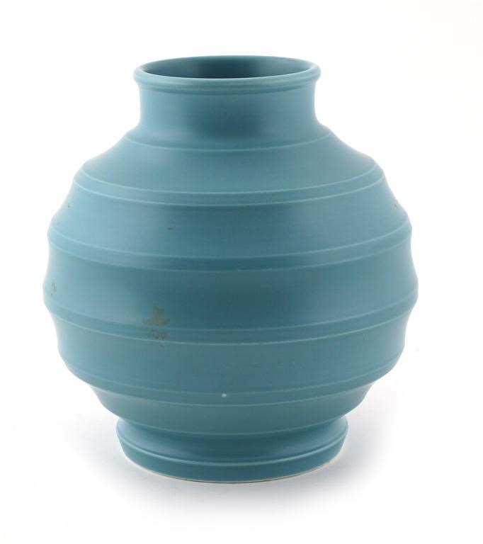 A Wedgwood Matt Blue vase, designed by Keith Murray, ribbed, ovoid form, with collar rim, printed factory mark, KM monogram, tiny glaze nick, 19cm. high