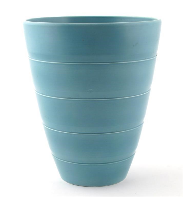 A Wedgwood Matt Blue vase, designed by Keith Murray, ribbed bucket form, printed mark, KM monogram 24cm. high