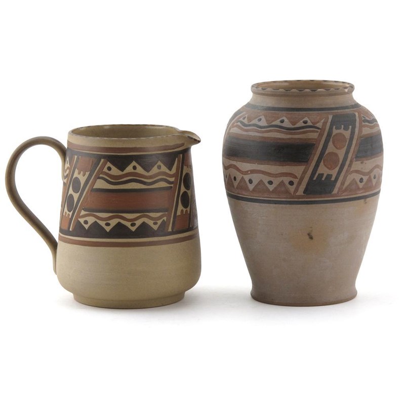 A Poole Pottery Etruscan vase, pattern HI, painted with geometric bands in shades of brown, and a Carter, Stabler & Adams jug impressed and painted marks 16.5cm. high