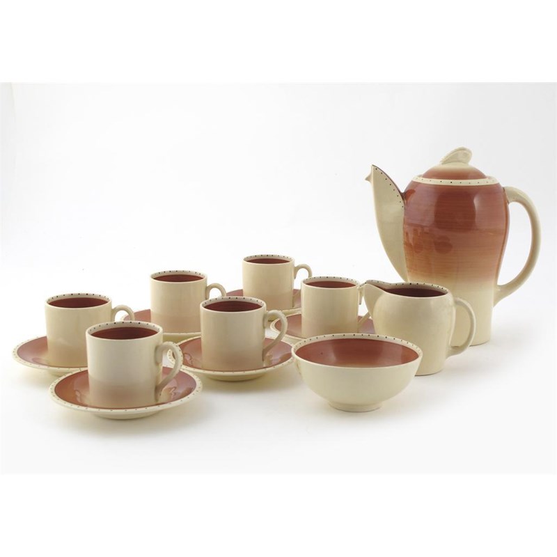 A Susie Cooper Production Kestrel coffee set for six, comprising; coffee pot and cover, milk-jug and sugar basin, six cans and saucers printed factory marks, coffee pot 19cm. high