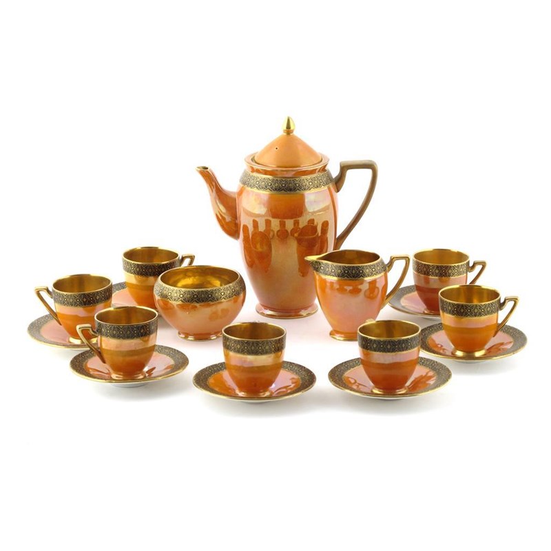 A Carlton Ware coffee set for twelve, pattern no.2979A, orange lustre below black band, highlighted in gilt, with gilt interior, comprising; coffee pot and cover, milk-jug and sugar basin, twelve coffee cans and saucers printed and painted marks 19cm. high