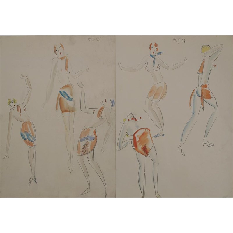 Two pages of pencil and watercolour wash figure designs by Dodo Burgner, annotated in pencil 14.1 25 and 26 sheet size 45 x 36cm.