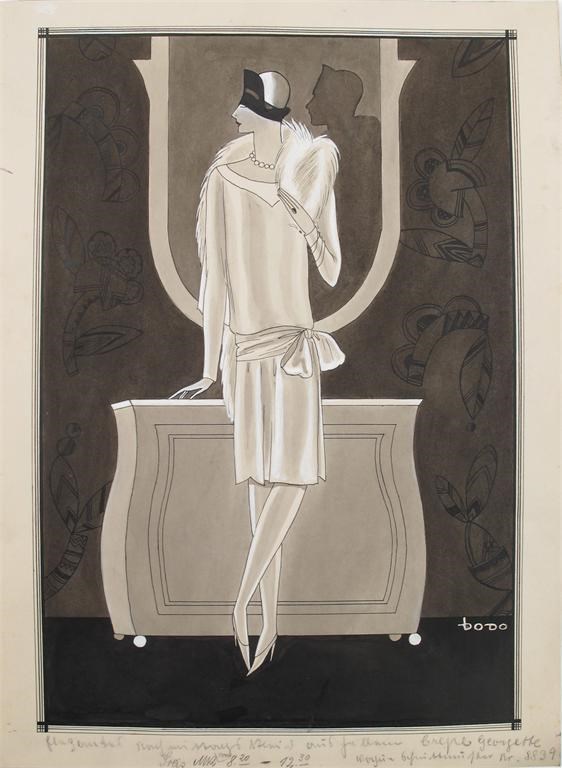 A pen wash on paper fashion design by Dodo Burgner, signed in white image 35.5 x 24cm.
