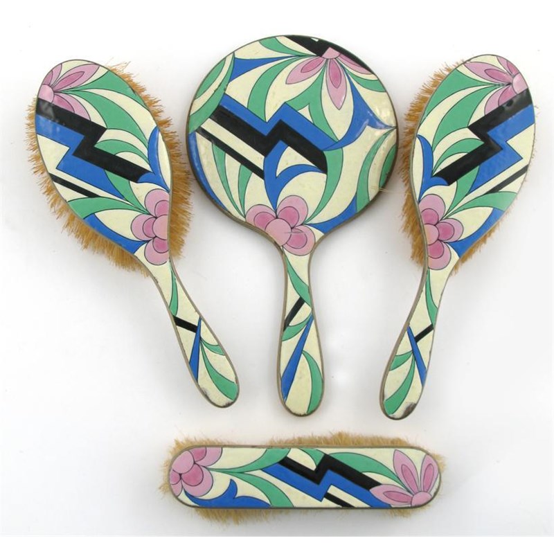 An enamelled dressing table set enamelled in shades of blue, black, violet and green with bold flowers and geometric design, comprising; mirror and three various brushes stamped marks mirror 24cm. high