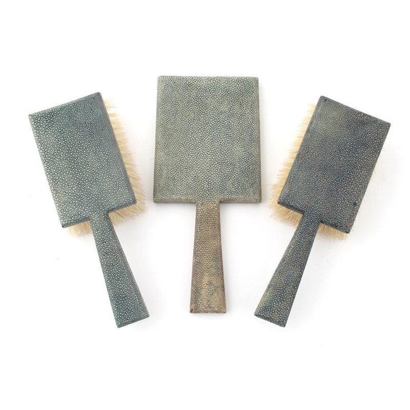A shagreen covered hand mirror and two en suite hair brushes, rectangular section, the mirror with ivory detailing 23cm high