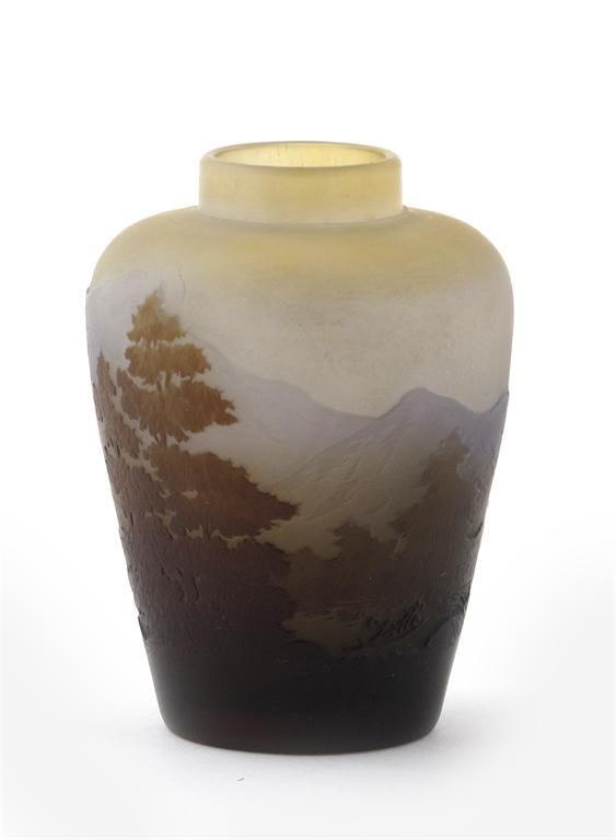 An Emile Galle cameo glass vase, shouldered form, decorated with a mountain landscape cameo signature 9cm. high