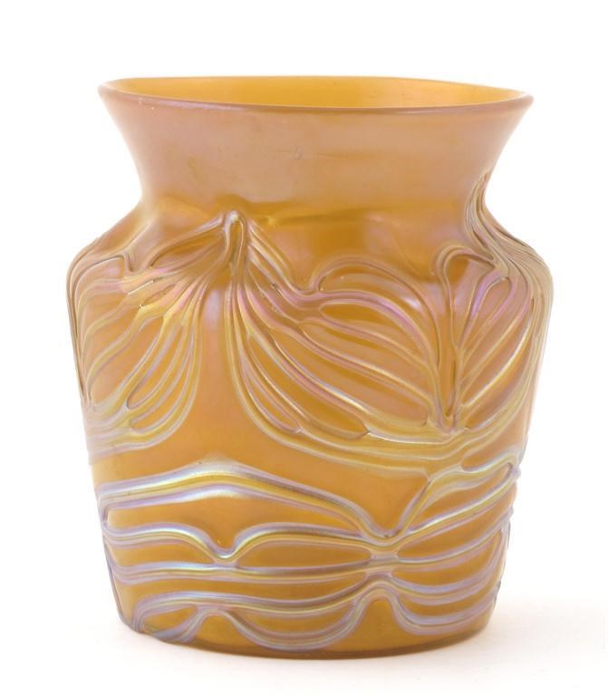 A Loetz glass vase, shouldered form with everted rim, the body decorated with trailing bands etched Loetz Austria 15.5cm. high