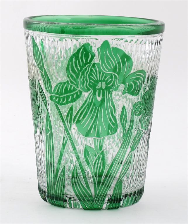 A Webb Cameo Overlay glass vase, flaring cylindrical form, green over clear faceted glass decorated with iris acid etched mark 20.5cm. high