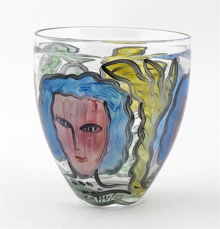 A Kosta Boda glass vase, painted with two female heads amongst foliage incised marks to base 14.5cm. high