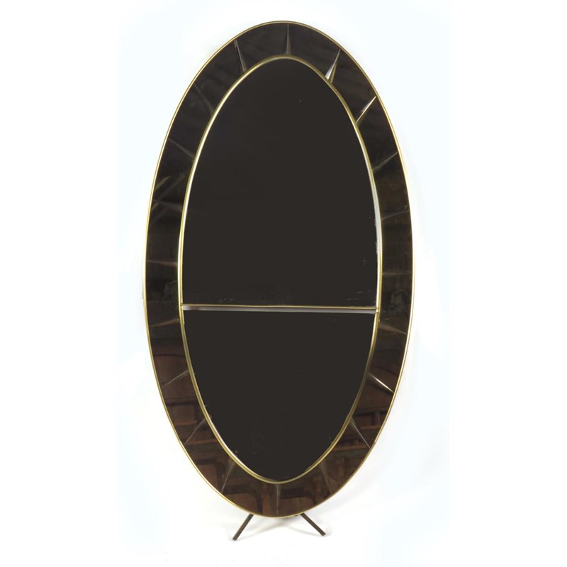 A large Crystal Arte floor mirror, oval glass with cut radial design, in brass frame, with clear glass shelf, 203cm. high