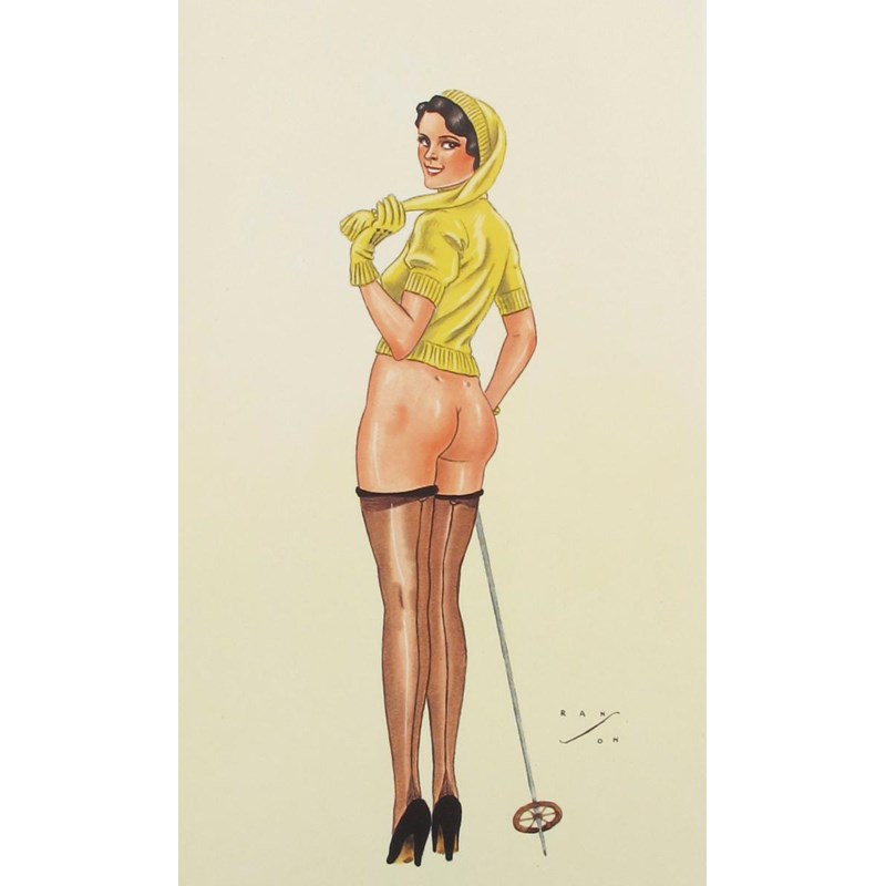 A lithograph of a 'Pin Up' skier by Rene Ranson