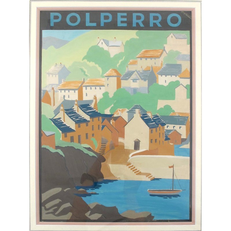 'Polperro' an original goucahe poster design on paper, framed unsigned, titled 45 x 32cm.