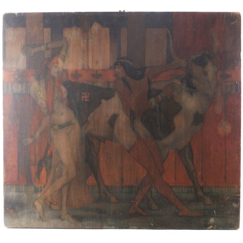 A painting on board by Vera Willoughby, depicting Egyptian dancers painted red monogram bottom left 67 x 74cm