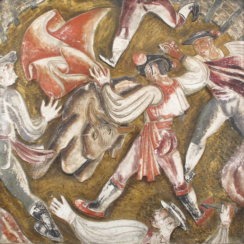 'The Bullfight' a plaster panel, rectangular with the matadors surrounding the charging bull, painted colour, framed, 50 x 50cm.