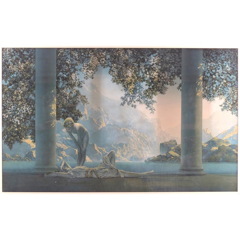 'The Garden of Allah' and 'Daybreak' two House of Art, New York colour prints by Maxfield Parrish, circa 1925, framed signed in the prints images 75.5 x 38cm.