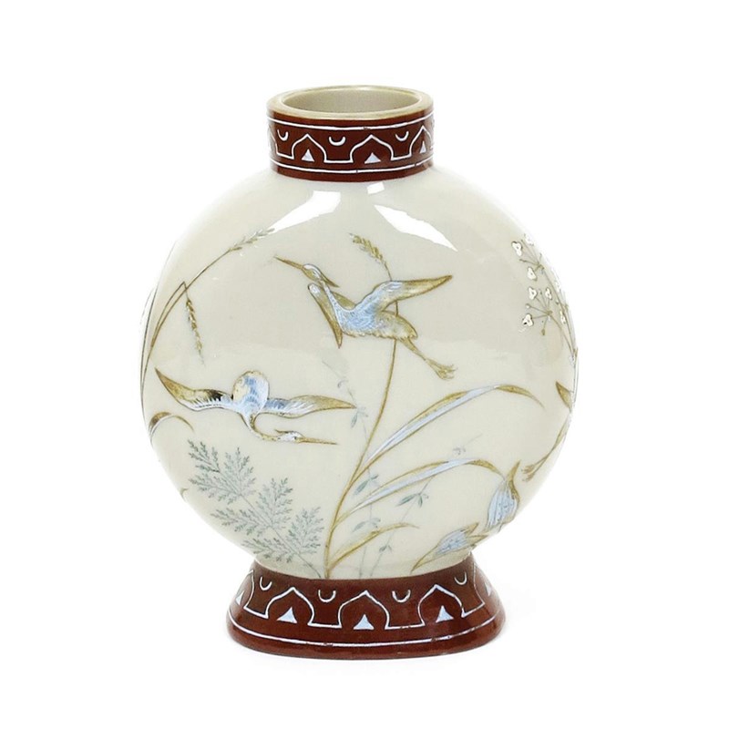 A Webb's Aesthetic Movement glass vase, the opal body enamelled with storks flying above grasses, between acid-etched red glass bands unsigned 20cm. high