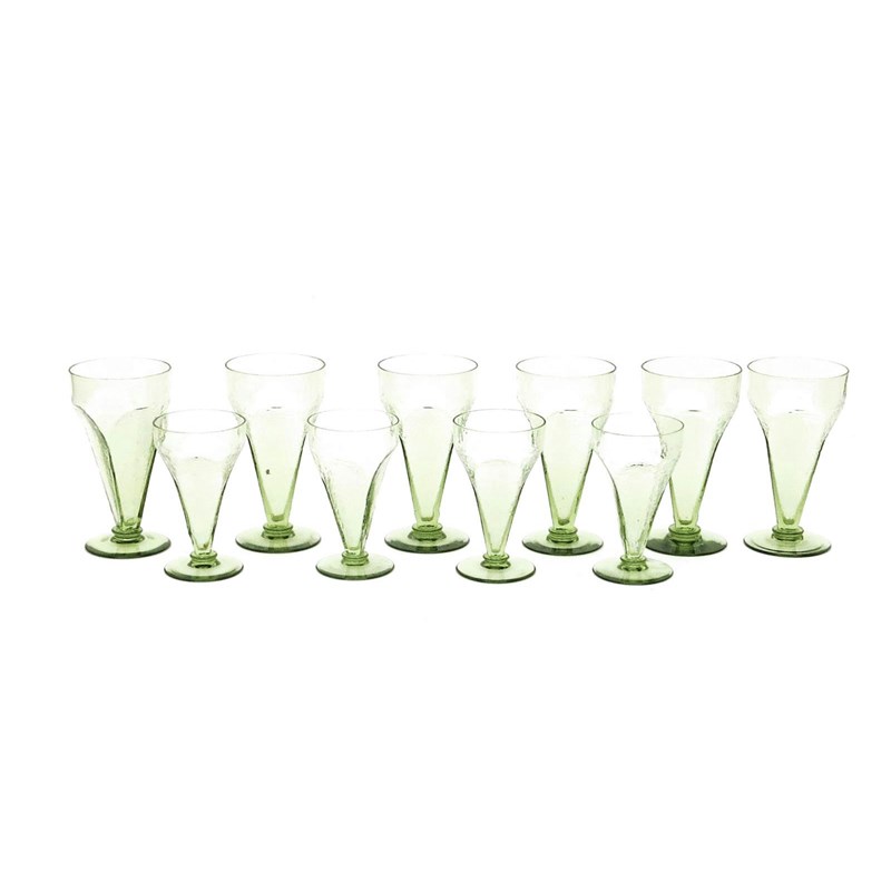 Six James Powell & Sons Whitefriars Sea Green M.54 beer glasses designed by Barnaby Powell, and four en suite R.154 wine glasses unsigned 16.3cm. high