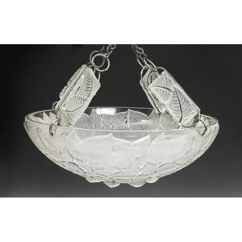 'Charmes' No.2458 a Lalique clear and frosted glass plaffonier designed by Rene Lalique, with chrome chains set with glass rectangular panels intaglio moulded R Lalique 34cm. diam.