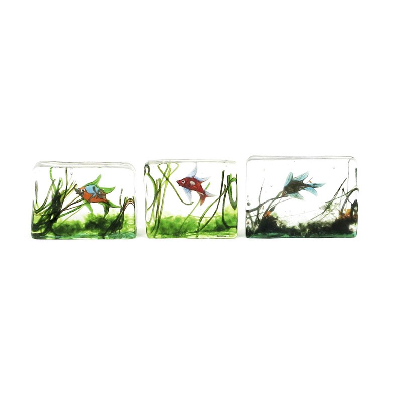 Three Murano Aquarium glass blocks possibly Cenedese, each internally decorated with fish and waterweed in colours, with air bubble inclusions, largest 15 x 10.5cm.