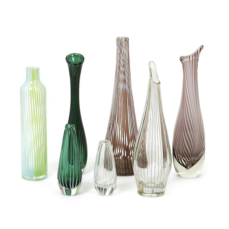 A Kosta glass bottle vase, emerald green glass with white stripes, cased in clear, and six other glass vases etched Kosta LH1056 33cm. high