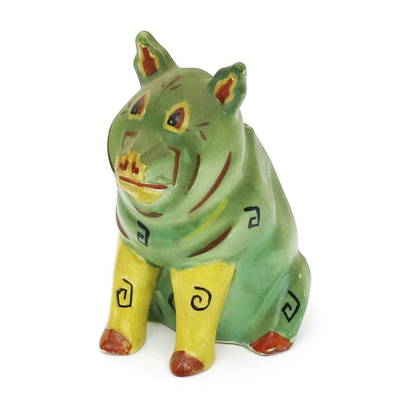 'The Lucky Pig' a Louis Wain porcelain pig, painted in shades of green and yellow highlighted in red impressed marks, facsimile signature 12cm. high