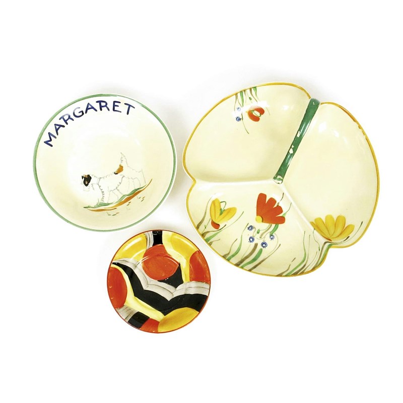 A Susie Cooper Productions trefoil serving dish, pattern 274, painted with daisies in shades of yellow and orange, a Susie Cooper bowl entitled Margaret, decorated with a terrier, and a small collection of Susie Cooper printed marks, 22cm. wide