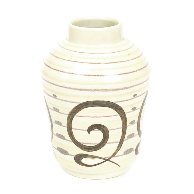 A Susie Cooper Studio vase, model no.283, shouldered form, painted with scrolls in brown and mushroom over fine yellow and rush bands incised marks, 22cm. high