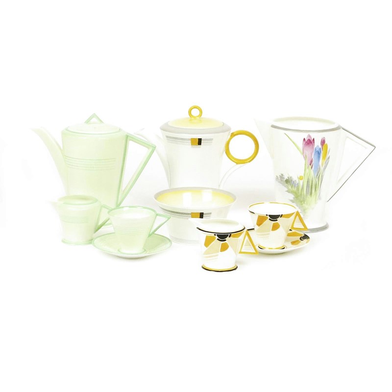 'Crocus' a Shelley China lemonade Eve shape jug, pattern 11952, printed and enamelled in colours, a Shelley Eve shaped coffee set for four painted with green bands, a Shelley Vogue Sunray coffee cup, saucer and milk jug, and a large collection of Shelley table ware, printed and painted marks, minor damages lemonade jug 18cm. high