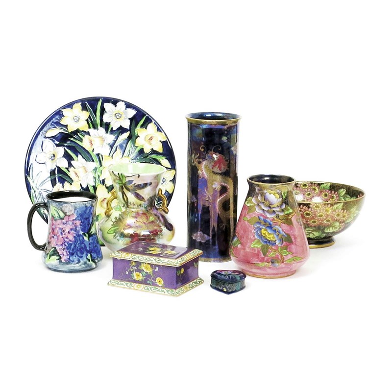 A Maling Pottery Dragon vase, pattern 3311, printed in colours on a blue lustre ground, highlighted in gilt, a Maling vase decorated with butterflies and flowers pattern 5955, another vase and a collection of Maling items printed and painted marks, 25.5cm. high