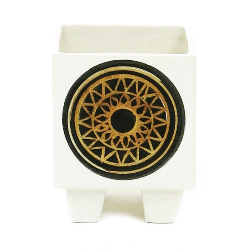A Troika Pottery Footed Smooth Cube vase, square section, each side printed and painted with an abstract roundel in brown on a white ground painted marks to feet 11cm. high