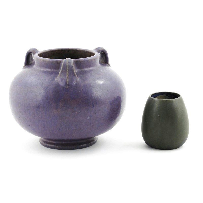 A Fulper Pottery vase, ovoid with three looped handles to shoulder, covered in a streaked purple glaze, and another small Fulper Pottery vase, impressed marks, small glaze fault to foot rim, 16.5cm. high