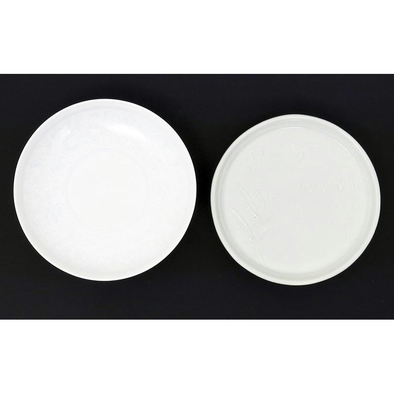 A pottery plate by Jill Fanshawe Kato, modelled in low relief with a bird hovering above grasses, glazed pale blue, and a bowl by Alan Spencer Green impressed seal mark, 23.5cm. diam.