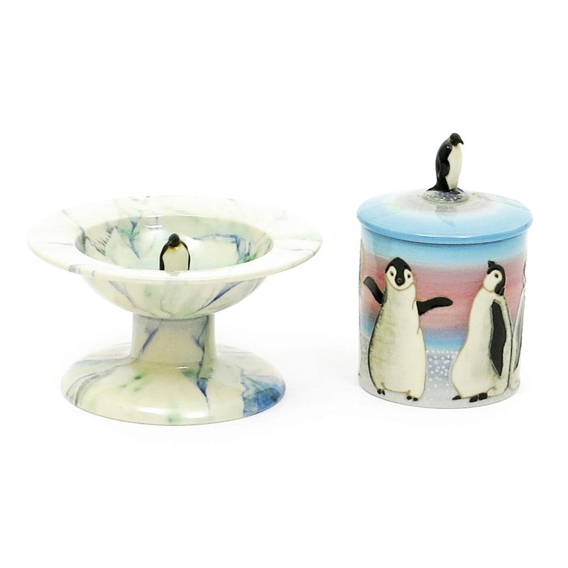 'Penguin' a Dennis Chinaworks tazza and preserve pot and cover designed by Sally Tuffin