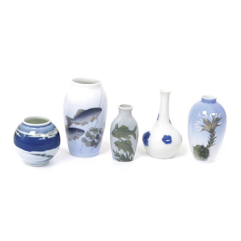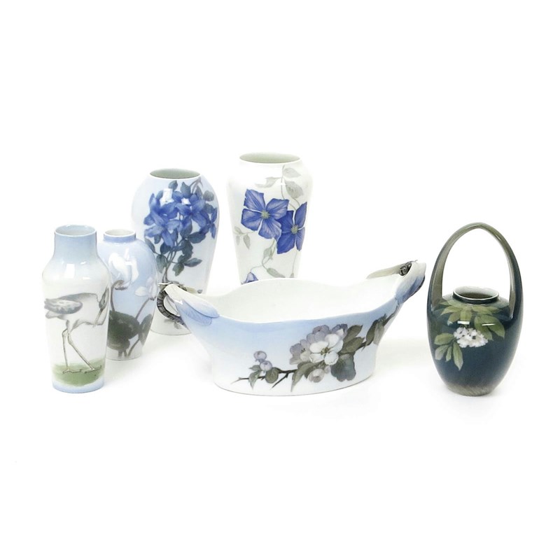 A Royal Copenhagen porcelain vase, model 323, elliptical form cast with dragonfly handles, painted with prunus blossom in colours on a pale blue ground, and a collection of eleven Royal Copenhagen, Rosenthal and other pieces impressed, printed and painted marks, damages 31cm wide